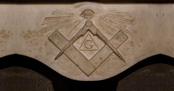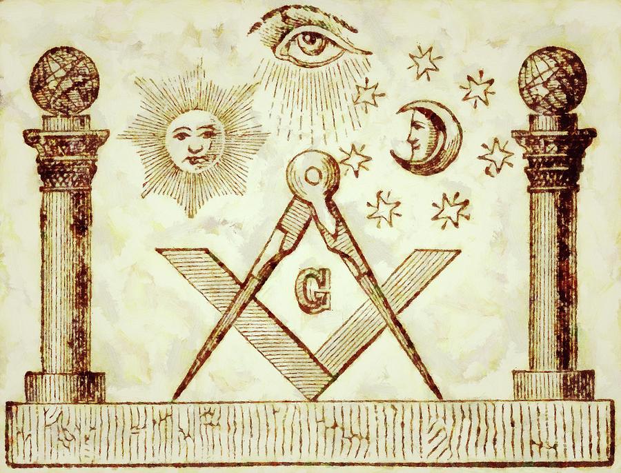 Symbole masońskie, w tym chyba najsłynniejszy atrybut masońskiej ikonografii – cyrkiel i węgielnica oraz oko opatrzności.