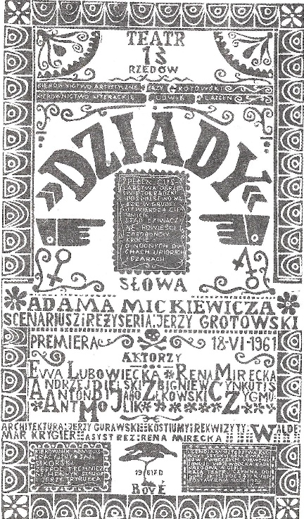 Afisz teatralny z “Dziadów” w reżyserii Jerzego Grotowskiego, rok 1961.